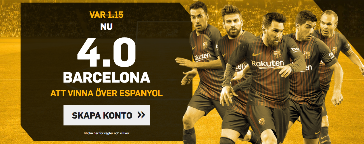Barcelonaderby! De här derbyna tenderar till att bli riktigt underhållande – och vi hoppas givetvis att lördagens derby inte är något undantag. Spelbolaget Betfair väljer att boosta oddset på Barcelona i derbyt. Istället för det ordinarie oddset 1,15 får ni nu hela 4,00 för en Barcelona-seger. Erbjudandet gäller enbart för nya kunder.