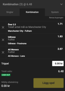 Man City över 2.5 mål, Udinese att vinna över Frosinone och så det raka spelet på Monaco, vi får fina 6.48 gånger pengarna för den här trippeln hos Unibet och har ni ännu inte ett konto hos den svenska speljätten, väntar 100 kr freebet på er via länken precis här under bilden. Stort lycka till nu!