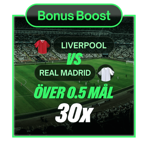 Oddsboost ENDAST för nya kunder hos ComeOn! Speljätten boostar oddset på över 0.5 mål i stormötet mellan Liverpool och Real Madrid. Just nu 30x pengarna! Maxinsats 25 SEK. Spelstopp den 4 november, 21:00.