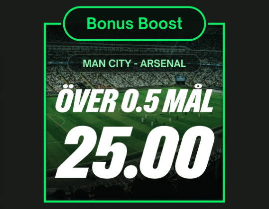 - SPELA DIN INSATS: Lägg ett spel på över 0.5 mål i matchen med en maxinsats på 25 kr (du kommer att se BonusBoost på kupongen när du markerar ditt spel)
